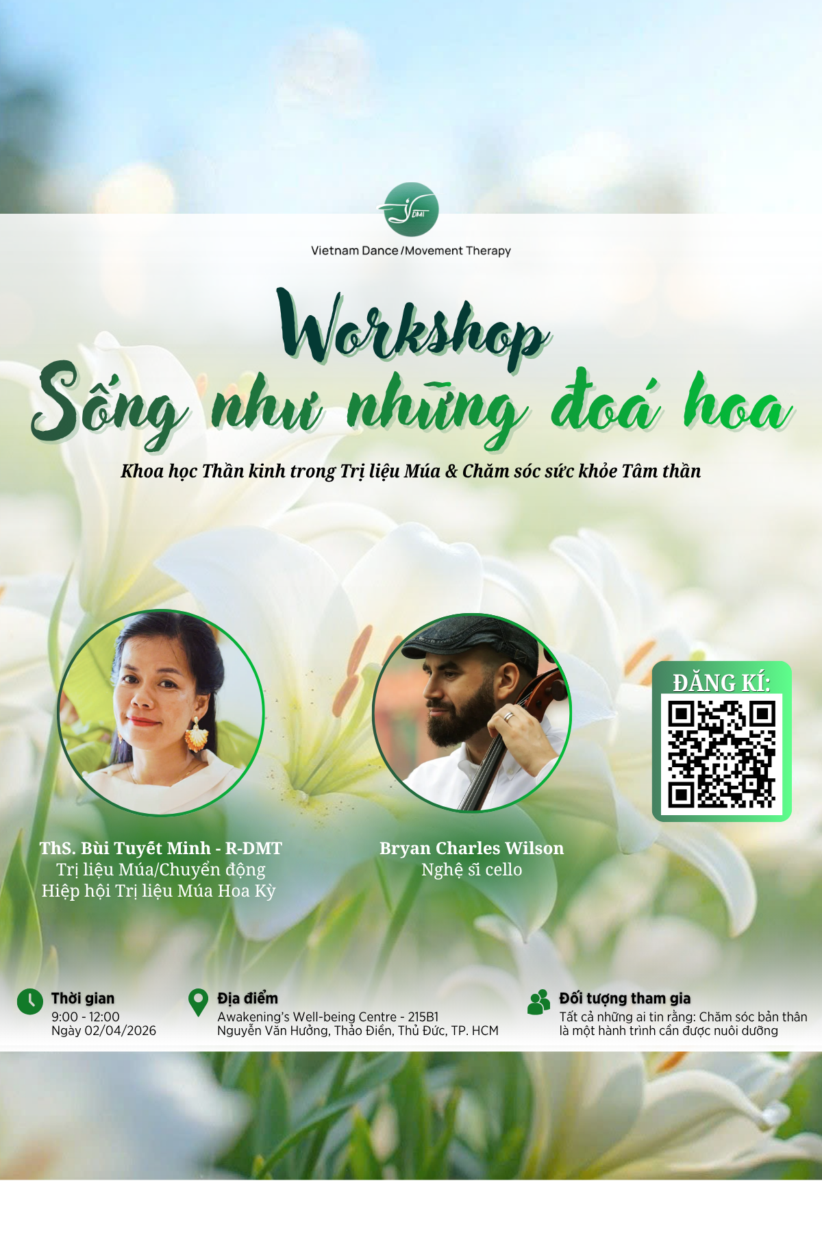 Nếu bạn đang tìm kiếm một chốn nghỉ ngơi để kết nối lại, workshop "Sống Như Những Đóa Hoa" chính là không gian để bạn được là chính mình, thông qua sự giao thoa giữa Trị liệu Múa/Chuyển động (DMT) và các kiến thức từ Khoa học thần kinh (Neuroscience).