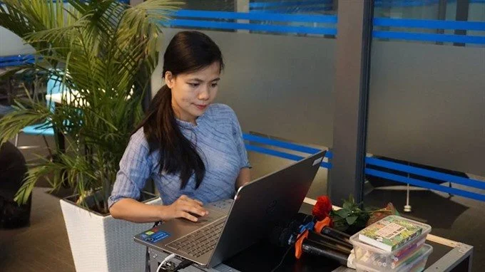 Bùi Tuyết Minh works at her office.